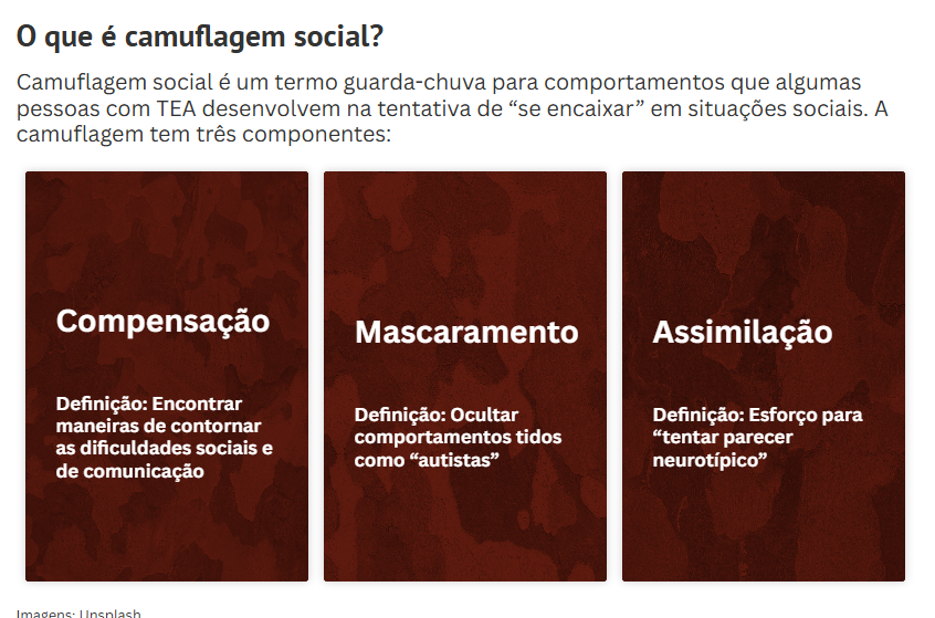 A pesquisadora explica que camuflagem social é um termo guarda-chuva para diferentes tipos de estratégia. “Seria o esconder, mascarar ou modificar algum comportamento para atender às demandas sociais, situações nas quais aquele comportamento não seria visto como ‘adequado’”, afirma.