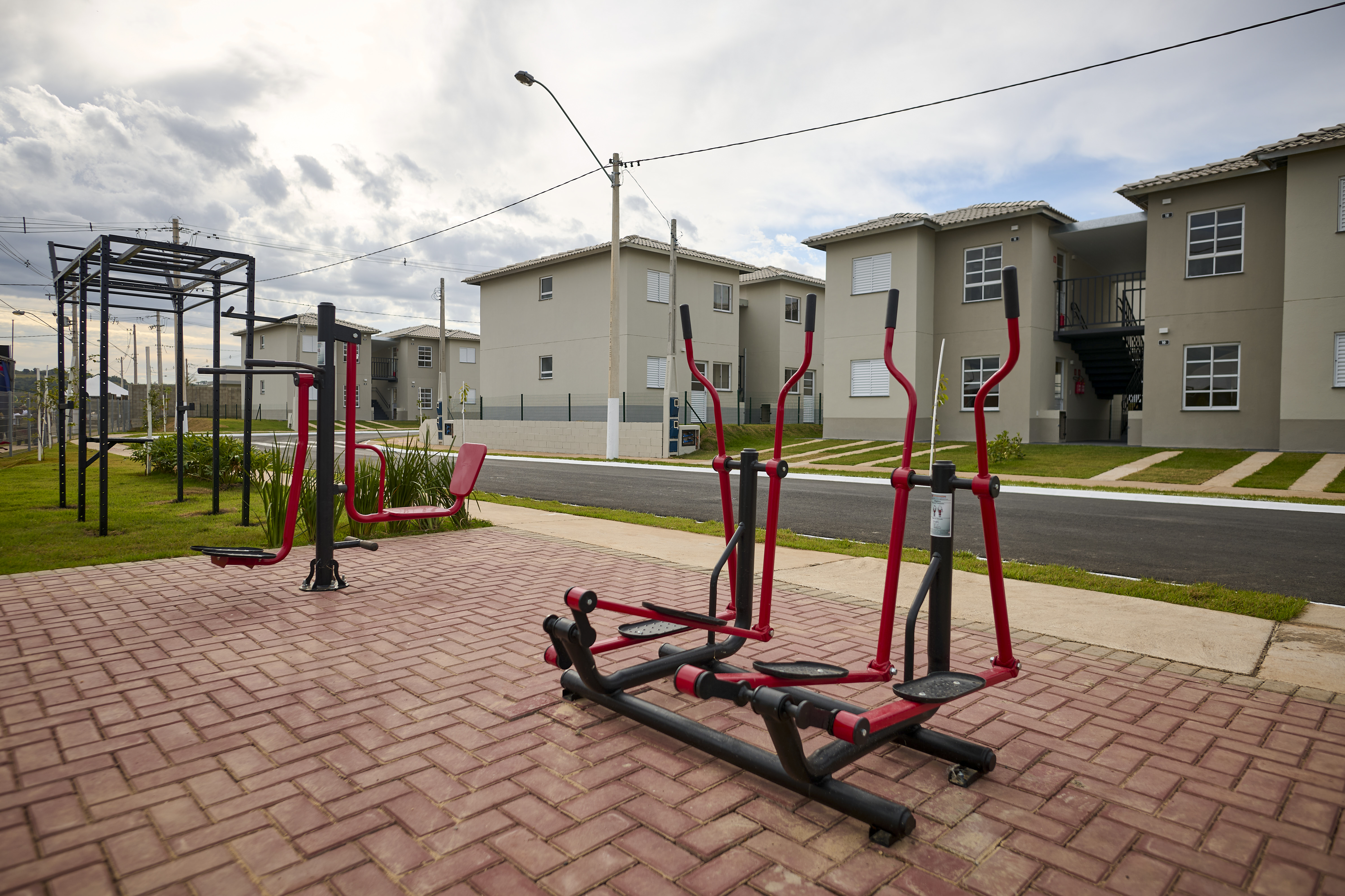 O empreendimento é composto por casas sobrepostas, com 43 m² de área construída, dois dormitórios, sala, cozinha, banheiro, lavanderia e uma vaga de garagem. O condomínio é fechado e conta com áreas de lazer, como academia ao ar livre, espaço de convívio, playground e áreas verdes.