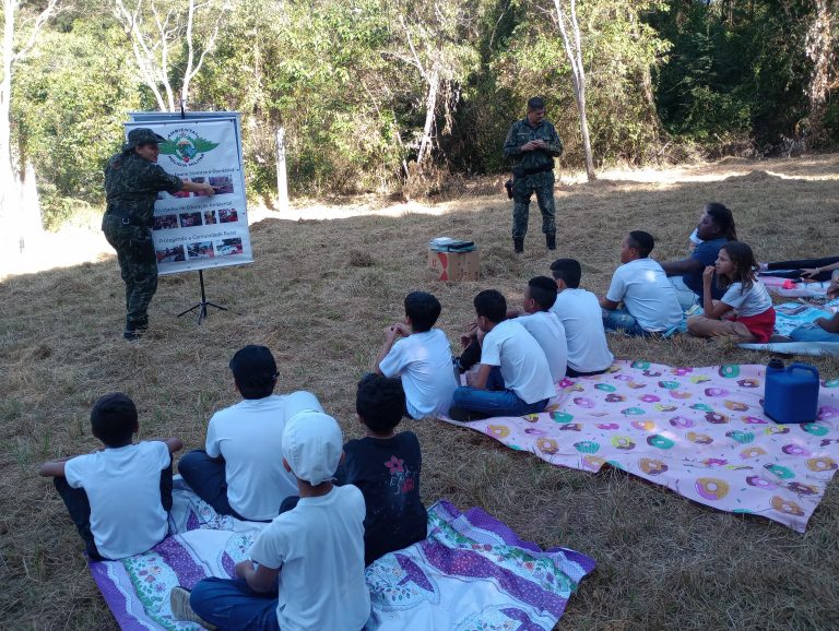 Atividades lúdicas com pintura, explicações e gibis aproximam crianças dos temas ambientais em ação da Polícia Militar Ambiental do estado de SP